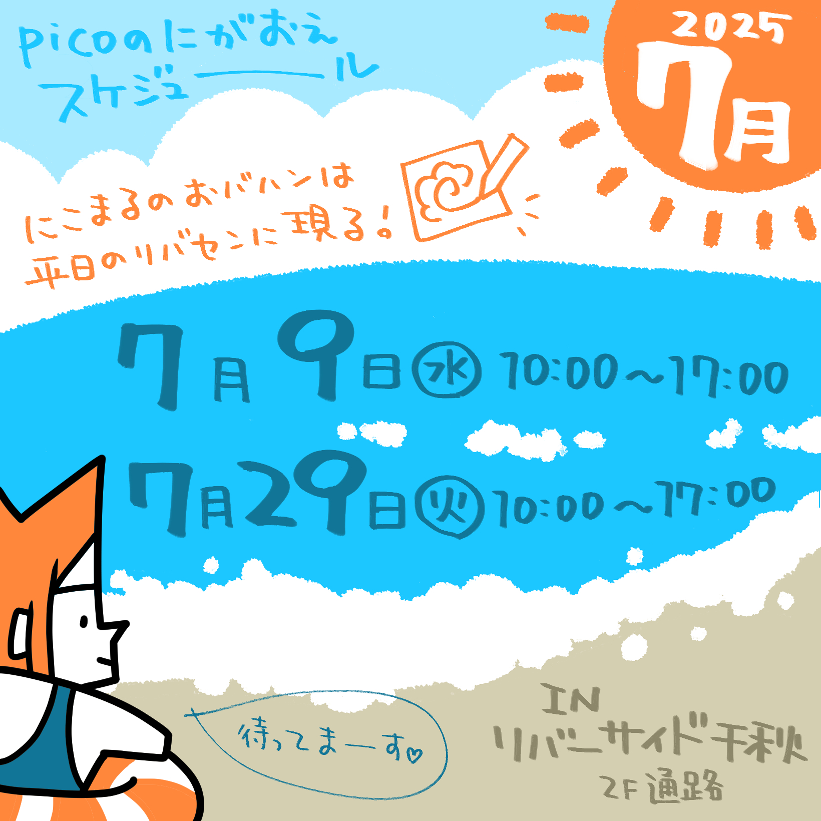 今月picoが出演する似顔絵イベントを、まとめてお伝えします。 2025年7月9日(水)10:00~17:00リバーサイド千秋(長岡市)2F illusie300店舗前制作料金:お1人様 1,800円 追加1名様毎に +1,000円写真制作 +500円制作時間:お1人様20分~ 2025年7月29日(火)10:00~17:00リバーサイド千秋(長岡市)2F illusie300店舗前制作料金:お1人様 1,800円 追加1名様毎に +1,000円写真制作 +500円制作時間:お1人様20分~ ※すべて色紙サイズになります。色紙以上の大きいサイズは、後日制作・郵送させて... -