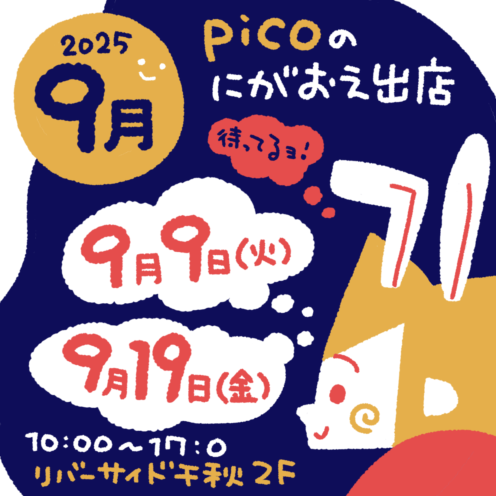 今月picoが出演する似顔絵イベントを、まとめてお伝えします。 2025年10月5日(日)10:00~17:00リバーサイド千秋(長岡市)2F illusie300店舗前制作料金:お1人様 1,800円 追加1名様毎に +1,000円写真制作 +500円制作時間:お1人様20分~※珍しく日曜日出店です。今まで曜日合わなかった方、カモン! 2025年10月9日(木)10:00~17:00リバーサイド千秋(長岡市)2F illusie300店舗前制作料金:お1人様 1,800円 追加1名様毎に +1,000円写真制作 +500円制作時間:お1人様20分~ 2025年10月29日(... -
